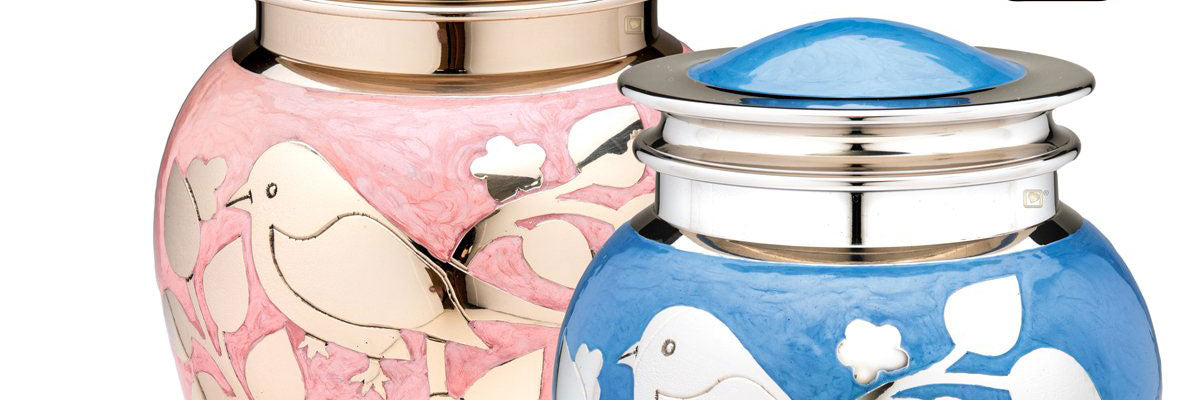 Stunning gold birds are hand engraved with incredible detail on baked enamel surface. The hand-engraving cuts through the enamel to reveal a dazzling gold against the cerulean and roseate backgrounds. This exceptional urn is the perfect memorial to honor your loved one.